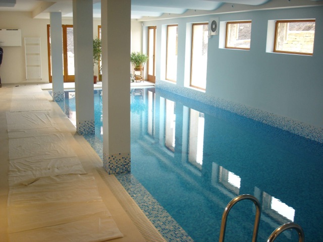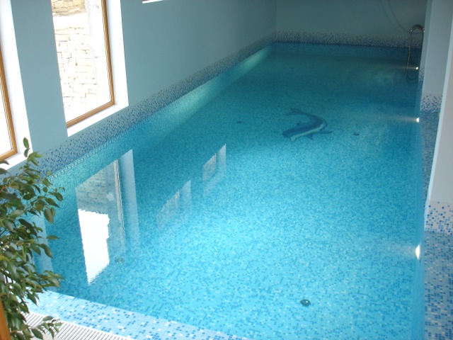 Piscina cu luciu de apa. Placare cu mozaic de sticla. Hidroizolatie, adezi