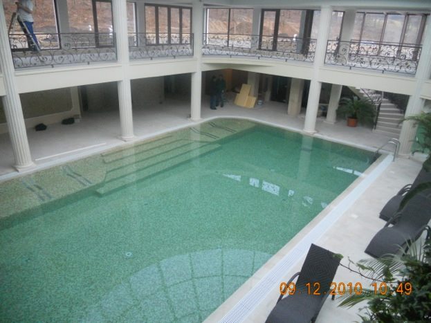 Piscina cu luciu de apa. Placare cu mozaic de stoical si FLOORGRES. Hidroi